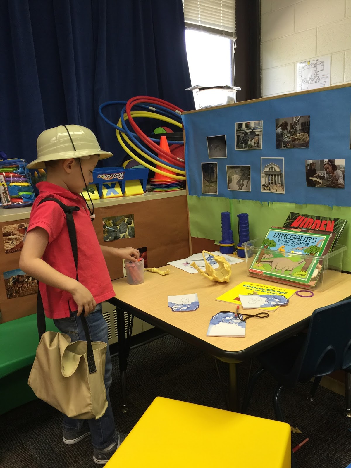 While we didn't focus on the actual names of the dinosaurs, we discussed the different characteristics that each of them had. We talked about sharp claws & teeth, bony plates, scaly skin, large/small feet, wings and tails. We also discussed some of the different kinds of bones that each dinosaur had. Lastly, we talked about where the dinosaurs lived, what they ate and if they could fly, swim, walk or run. In the end, we even uncovered "dinosaur eggs" in our language experience time & made our own volcano erupt!